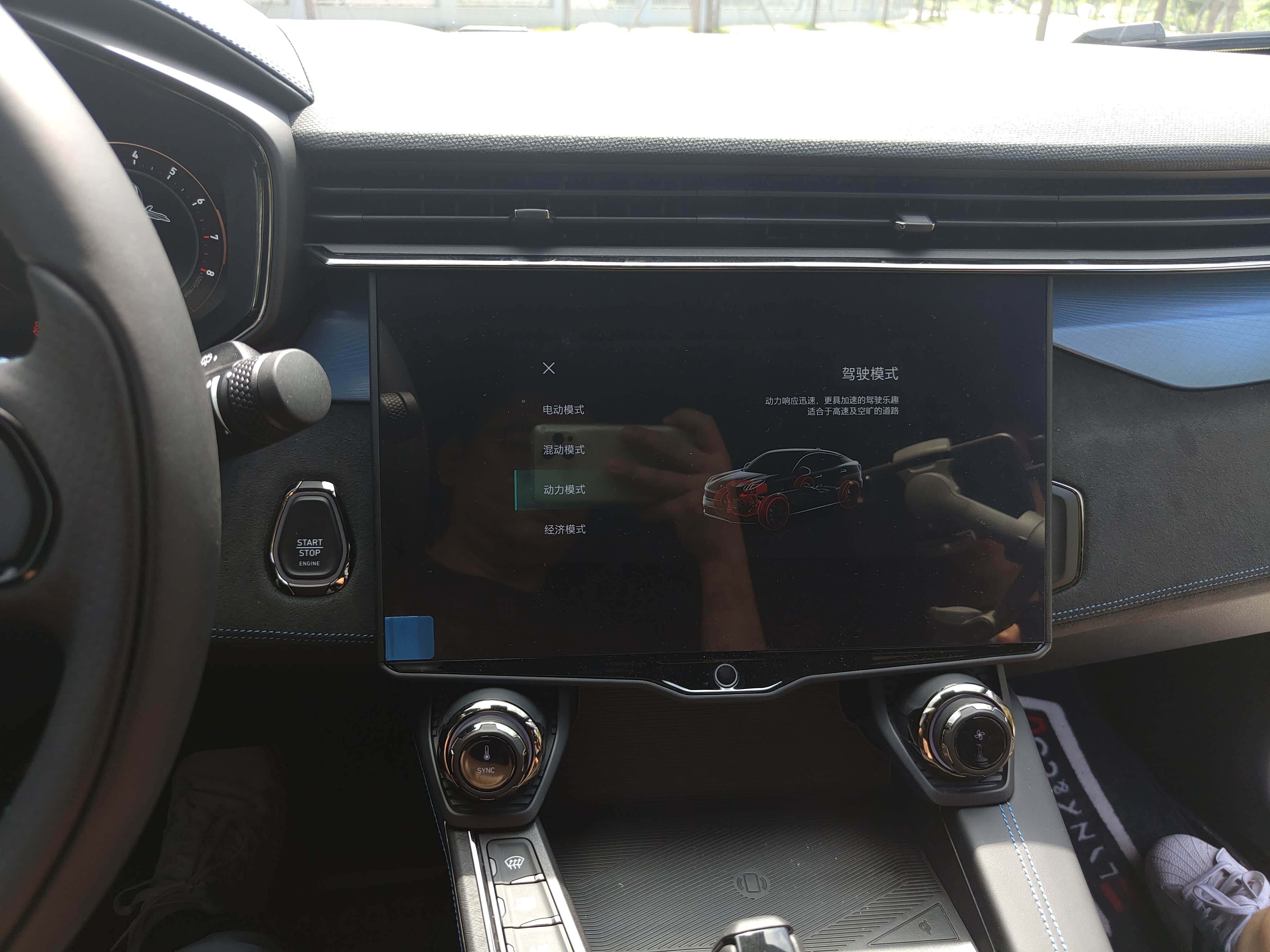 小巧的电子挡杆也是领克的常规操作,而这次在旁边设计了一组驾驶模式选择的拨片,可以调出四种不同的动力组合,包括纯电、混动、动力、经济。其实还有一种模式需要在大屏幕里面调出来,那就是动力电池模式,提供了动力电池充电和电量保持模式,这样可以在高速巡航状态下拥有足够的剩余电量,确保动力冗余和驾驶性。
