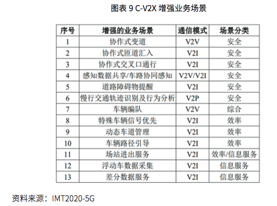 借助于人、车、路、云平台之间的全方位连接和高效信息交互,V2X应用场景包括信息服务类应用、交通安全和效率类应用和自动驾驶的协同服务类应用。其中前两个又被称为是基础业务场景,后面一个为增强业务场景。