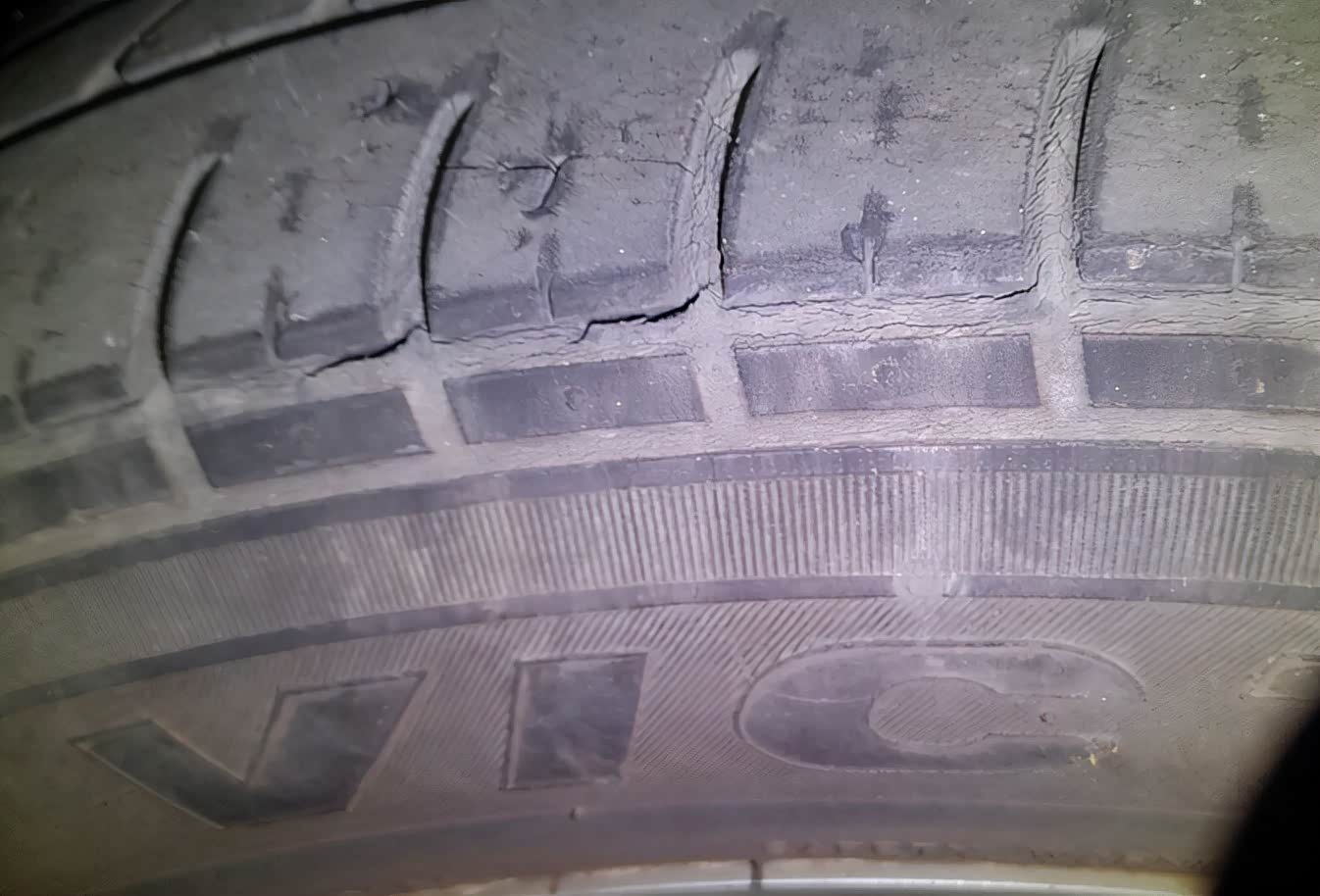 这个时候,我们可以根据轮胎的质感以及划痕的情况进行考量。首先可以观察一下轮胎周围是否有龟裂的痕迹,如果在轮胎侧面或者是内圈边缘出现了这种龟裂纹理,那么就需要注意了,这是轮胎老化的征兆。