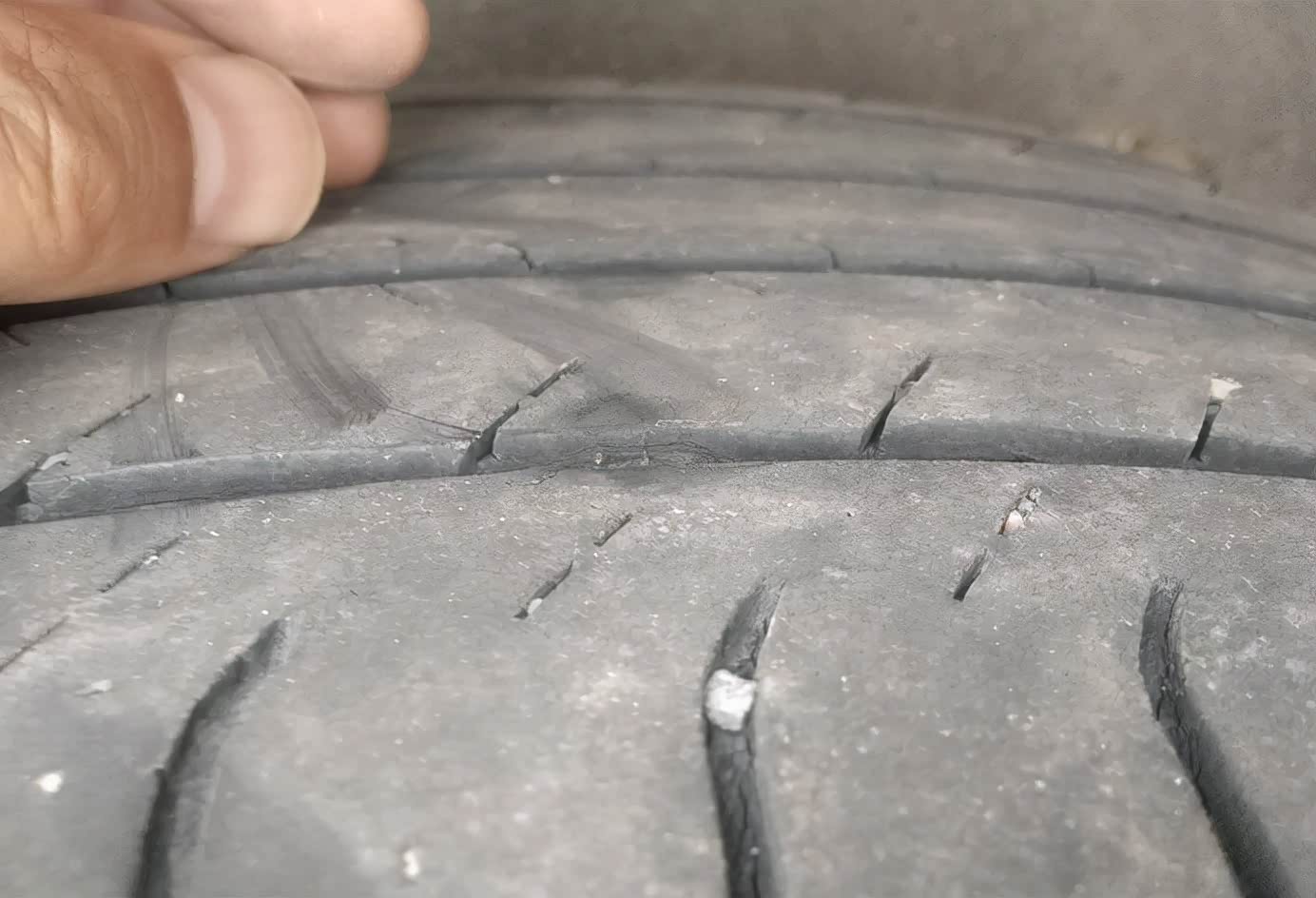 并且我们在用手触摸轮胎时,轮胎的手感并不是弹性十足,而是有的地方出现硬块感,有的地方光滑等情况,这也意味着轮胎处于老化阶段。通常出现这样的龟裂纹理,很有可能会导致轮胎有爆裂的风险。