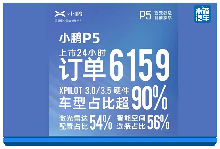 当然,小鹏P5的上市,很大程度上会帮助小鹏P7分担压力,实现“文体两开花”的局面,助小鹏汽车未来在销量上进一步激增。从上市后的市场表现来看,小鹏P5上市24小时就收获了6159辆订单,Xpilot3.0以上版本车型占比超过了90%。在所有的订单中,激光雷达占比有54%,智能空间选装占比也有56%,可以充分说明消费者认可小鹏P5的附加功能。