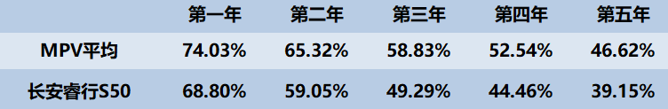 具体到长安凯程睿行S50保值率部分,该车前五年保值率分别为68.80%、59.05%、49.29%、44.46%、39.15%。尽管整体情况并不及MPV平均保值率(74.03%),但对比五菱宏光,倒是处于大差不差的水平。