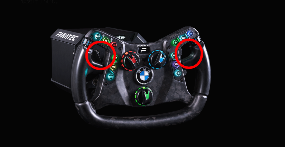 但只要对赛车方向盘略知一二的同学们便会立即反驳上文观点。还是以这套由宝马联合FANATEC推出的赛用/模拟两用方向盘为例,在红圈标注的地方,便是其“手抠”处,赛车手必须把自己的左右手大拇指分别伸进这两个小洞处,以此牢牢用双手“锁”这个方向盘。