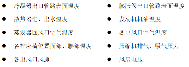● 温度分布均匀性:各工况稳定后前、后排呼吸点的平均温度差值(℃),各工况稳定后同排左右座椅呼吸口的温度差值(℃)。