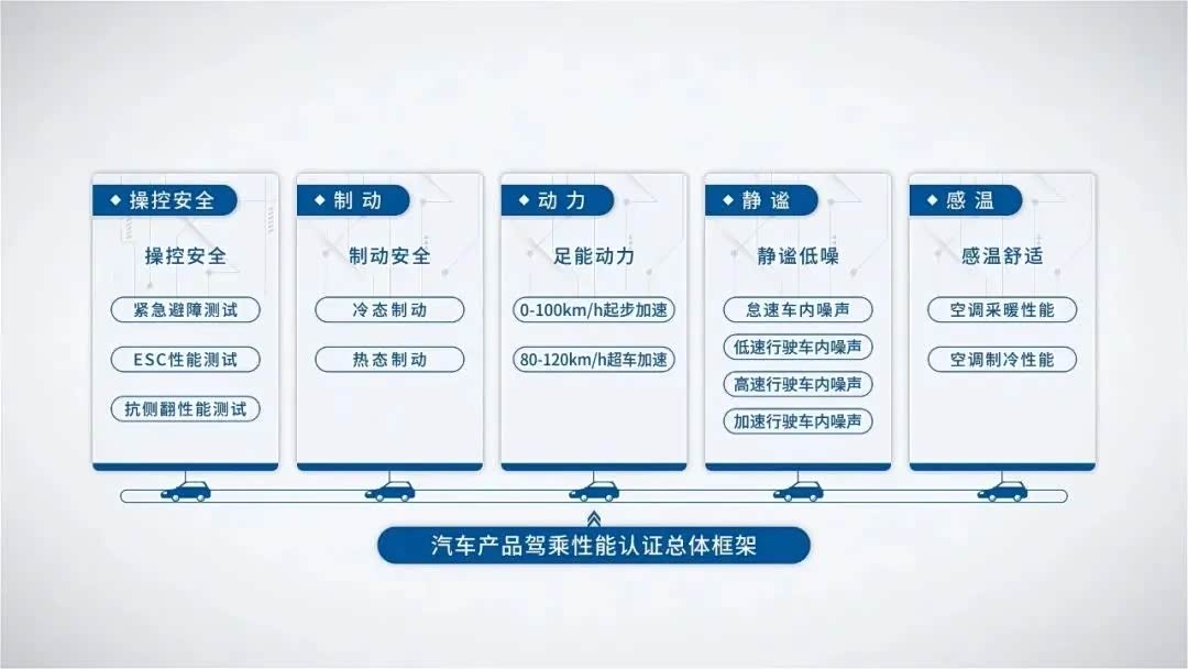 汽车产品驾乘性能认证包含操控安全性能、制动性能、动力性能、静谧性能、感温性能5大测试维度,13项测试子项目,致力于汽车产品质量优化,汽车品质体验提升。