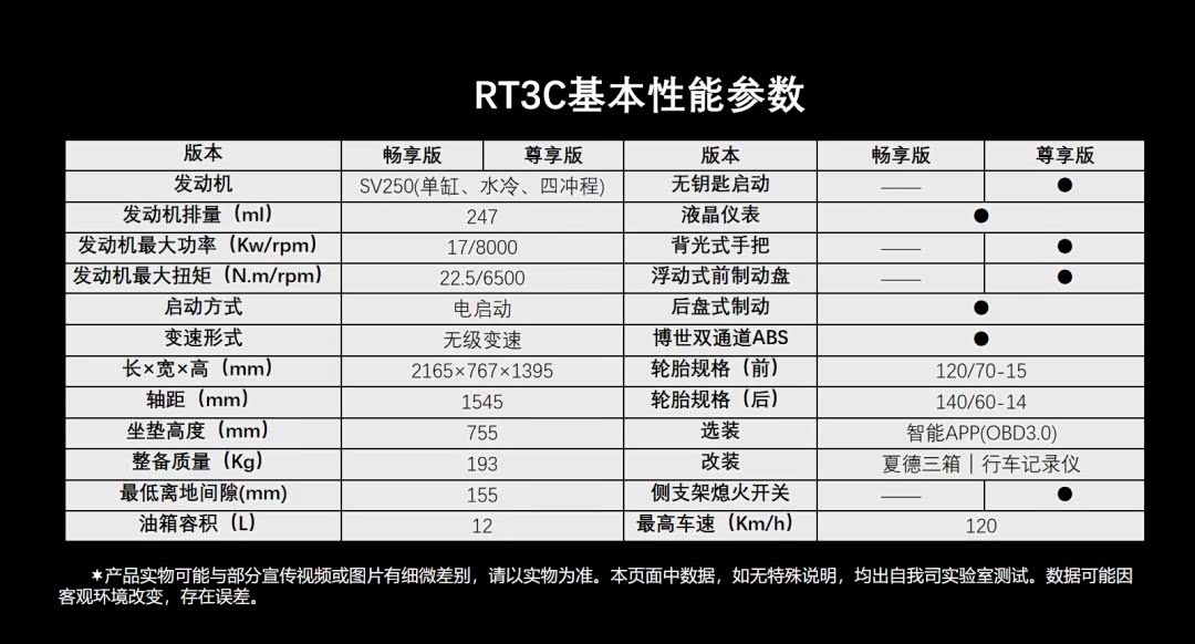 如果要问赛科龙RT3C两个版本之间的区别,各位车友可以参考上方车辆参数表!尊享版相比畅享版多出了无钥匙启动系统、背光式手把(夜间骑行方便操作)和前轮浮动式碟刹盘。但如果你的购车预算有限,则可以选择畅享版,能够减轻一些购车成本。