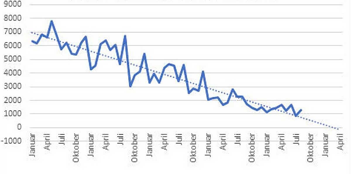 根据挪威汽车协会NAF(Norges Automobil Forbund)的研究数据,挪威在过去五年的汽油和柴油汽车的销售一直呈大幅下滑趋势,如果按照这个趋势曲线发展,最后一辆燃油车型将在2022年4月被销售,曲线到达纵轴为0的状态,这一时间点将比挪威政府的计划目标大大提前。