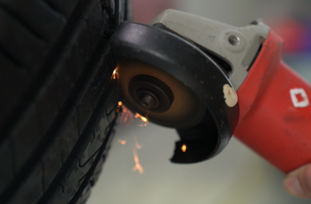 最终的结果是:测试员使用钢丝锯仅仅能锯开轮胎胎冠的橡胶层,而后就无法再进半寸。改用链锯之后,轮胎胎冠、胎侧被彻底切开,但最终没能成功切断轮胎的趾口。最终使用电动砂轮机!在一阵火星四溅之后,轮胎这才应声而断!