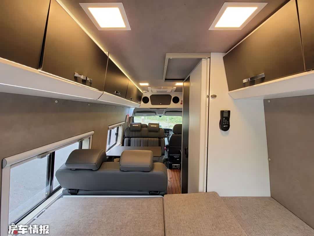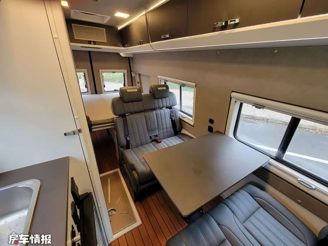 走进车身内部,浑然不觉的像是一辆B型房车,整体的空间表现都比较不错,尤其是采用了皮质软包的四人对卡座沙发更彰显了全车的豪华商务感,中间搭配了一张大尺寸的升降餐桌,平时可以容纳四个人在这里吃饭就餐或者商务洽谈。