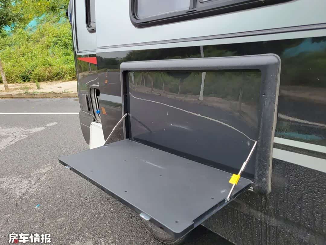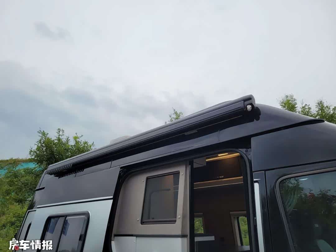 全车采用低调商务的亮黑色,搭配银色的拉花设计,沉稳又大气,车身外部的生活配置还是比较齐全的,包括车身右侧上方的手动遮阳棚以及下方的外置桌板和抽拉式电磁炉,也可以满足在车身外面做饭炒菜的需求。