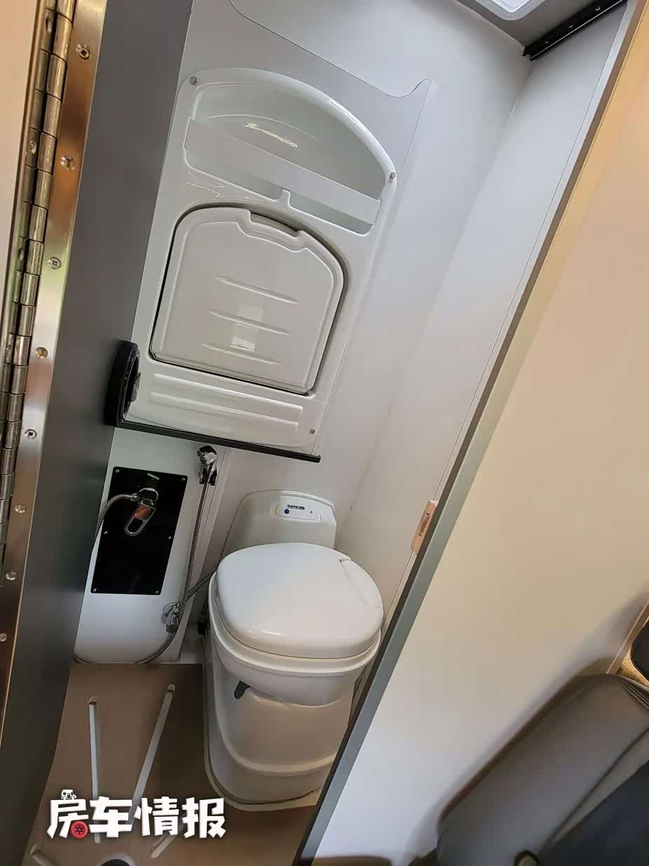后方的卫浴室平时是和厨房操作台齐平的,当需要使用的时候就可以整体推拉向外拓展,完全可以容纳一名成年人使用,内部配备了马桶、折叠洗手台、淋浴花洒和换气扇,可以满足出行的基本洗漱需求。