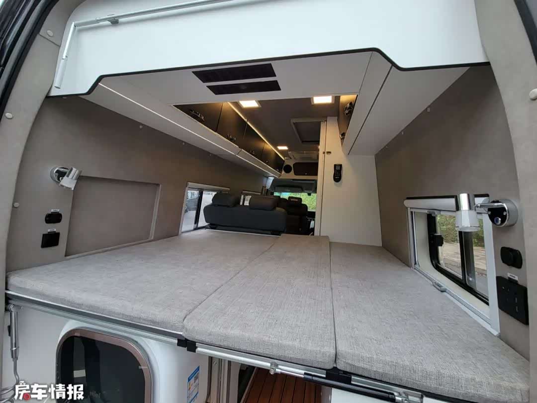 车厢尾部的休息区是以横置双人床的形式设计的,平时不需要时,收起床板可预留出中间的过道区域,可以存放旅行中携带的行李箱,晚上就可以将床板下放,容纳两名成年人使用完全没有问题。