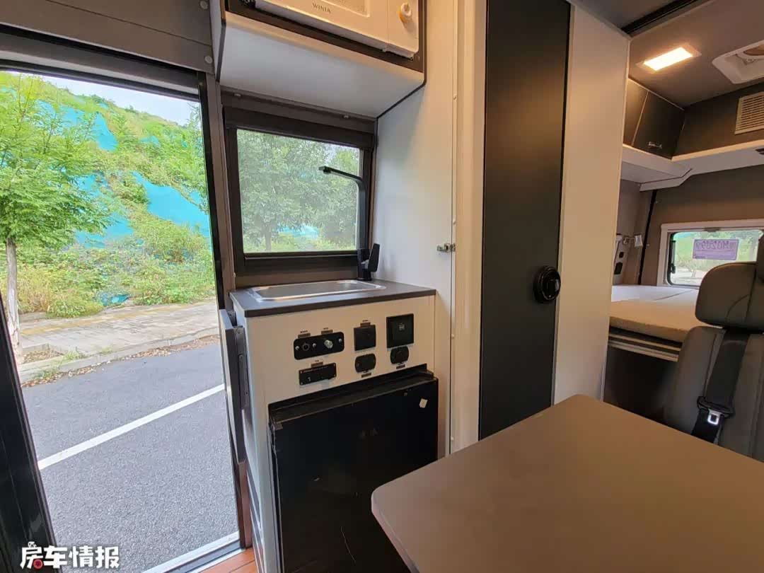 乘客门处的厨房操作台就比较小巧迷你了,只提供了一个不锈钢的洗菜池和一台108L的冰箱,不过旁边带有可拓展的桌板,也可以用来备菜。另外在上方还嵌入了一台微波炉,简单的热饭热菜也可以满足。
