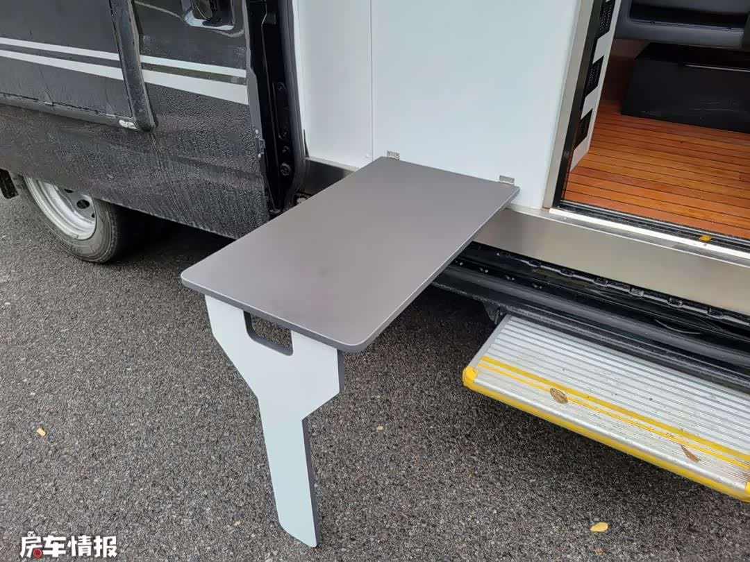 而在厨房操作台的外侧还带有一个折叠的小桌板,也就是说当乘客门打开时,车外可提供两张外置桌板供使用,