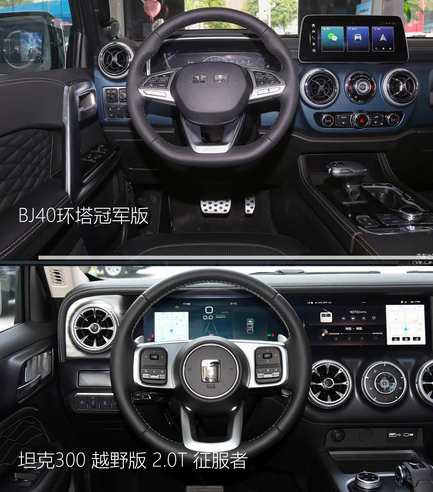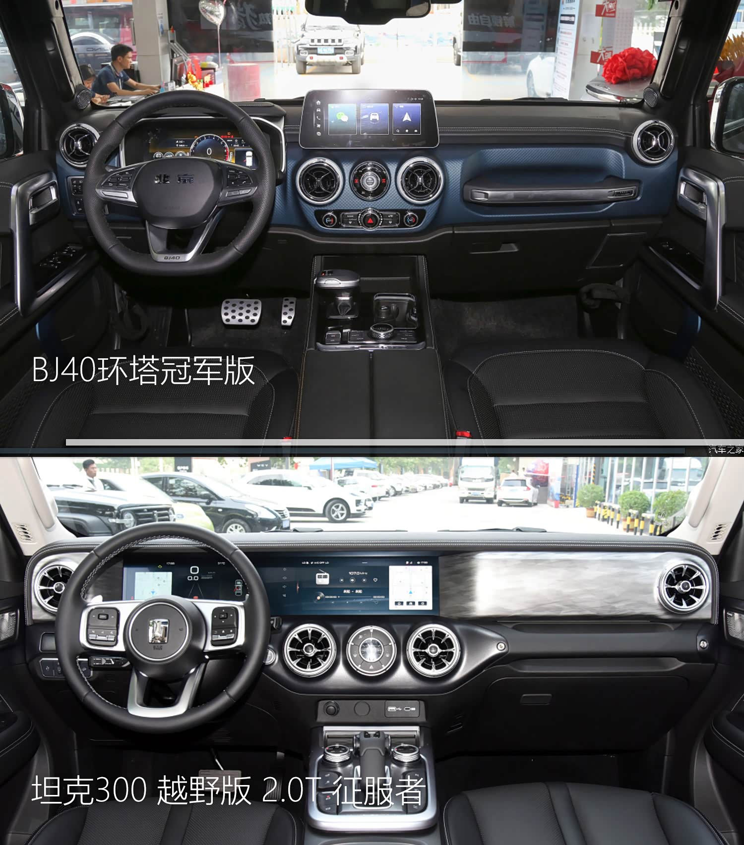 BJ40和坦克300的内饰相同点在于做工和用料,以前提到越野车内饰大家都会觉得比较“粗犷”。但现在情况完全不同,两款车型运用了很多软性材料,做工更加精细。