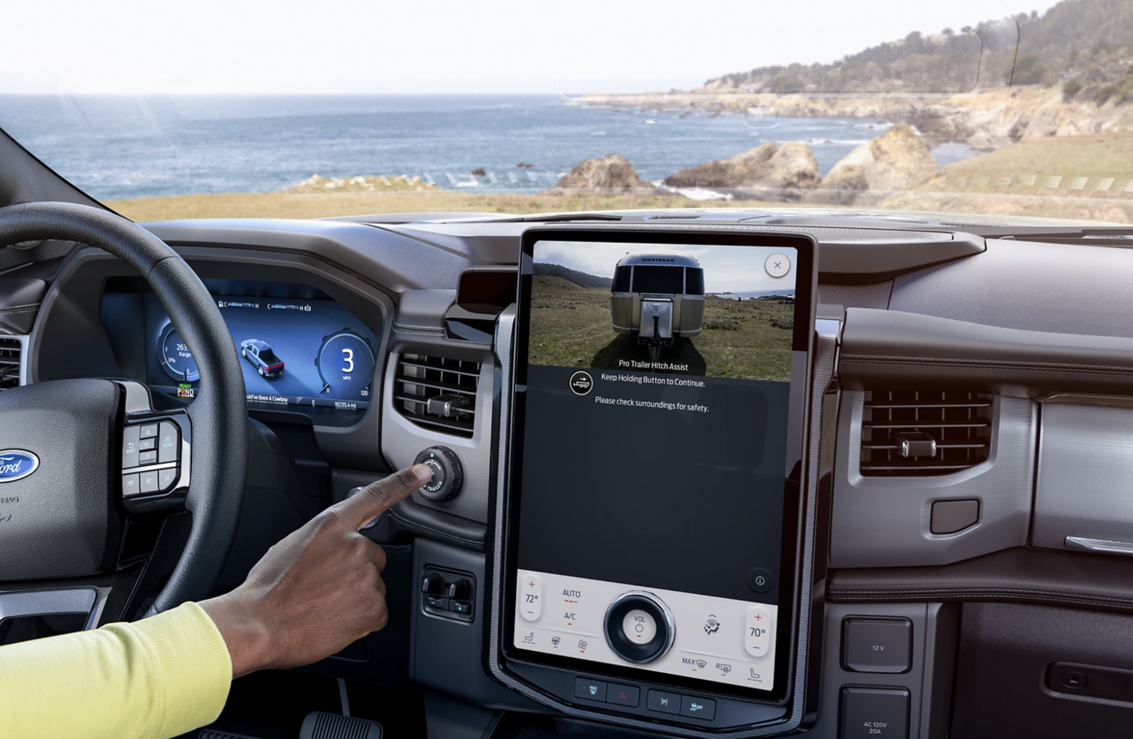 不只是牵引力本身有所提升,得益于整车电动化,通过中央控制器实时计算能够控制并实现更多的功能。还是以福特F-150 LIGHTNING举例,皮卡车型最常见的场景一个是载货,另一个就是拖车牵引。在F-150 LIGHTNING上,得益于专业的拖车辅助系统,车辆可以自动控制方向盘、油门及刹车来对其拖车钩和拖车耦合器,驾驶员需要做的只是按住按钮并且控制档位即可。而就是在F-150 LIGHTNING这样简单的操作,在燃油车型上,可能需要驾驶员通过车身周围的摄像头,不停的矫正车辆位置才能实现。