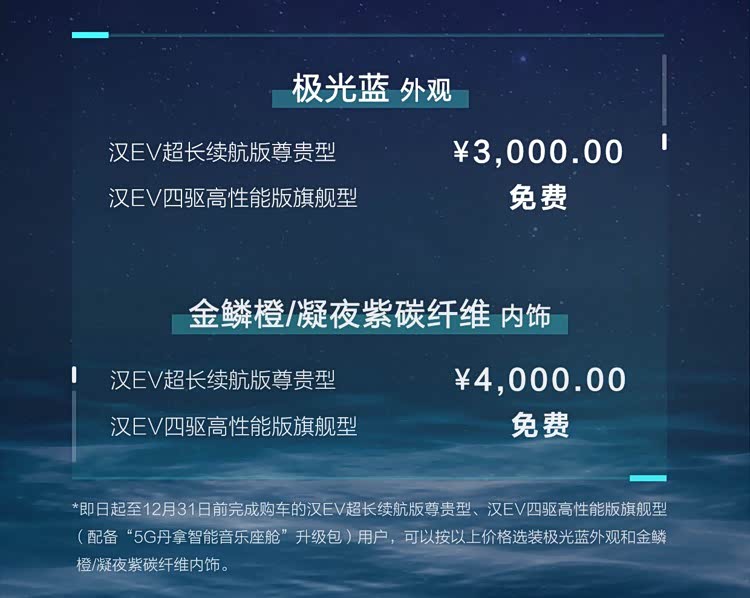 此次推出的汉EV新增了“极光蓝”的全新车漆配色,以满足当下年轻用户追求潮流、动感、个性化的购车需求。其中,超长续航版尊贵型在原先25.58万元指导价的基础上,需要另付3000元选装该配色,四驱高性能版旗舰型(配备“5G丹拿智能音乐座舱”升级包)的极光蓝配色指导价依旧为27.95万元。