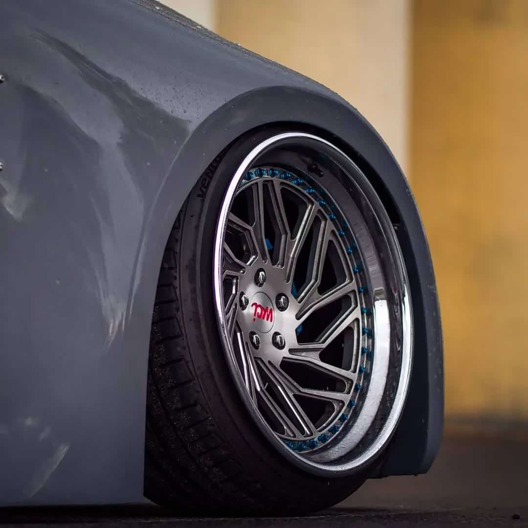 狠货都要留到最后,看着霸气的前脸是不是看上去更宽呢?没错,这是一台宽体V90,如此宽的车身看起来就更有气势了,大抛边轮毂搭配上贴地飞行的姿态,帅气十足!大尾翼十分的抢眼,虽然大嘴觉得稍微有些过分,不是那么协调。这姿态这气势,大嘴觉得就算奥迪RS6在旁边气势上也不一定会输。