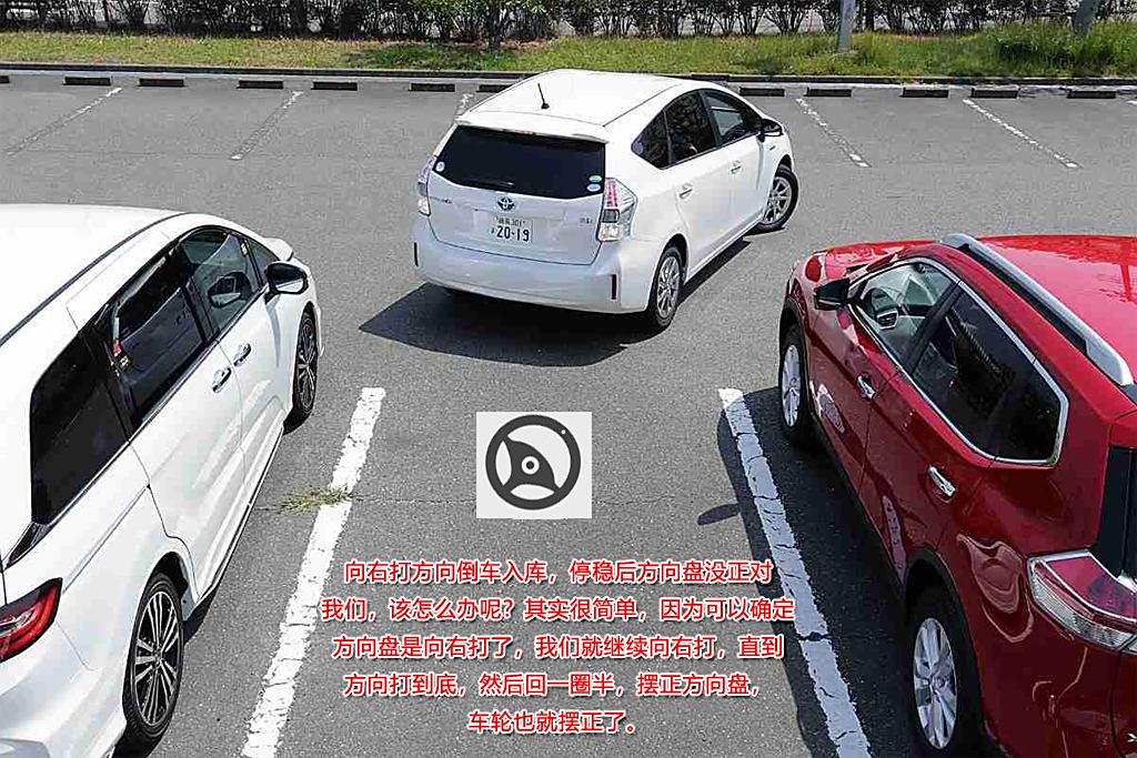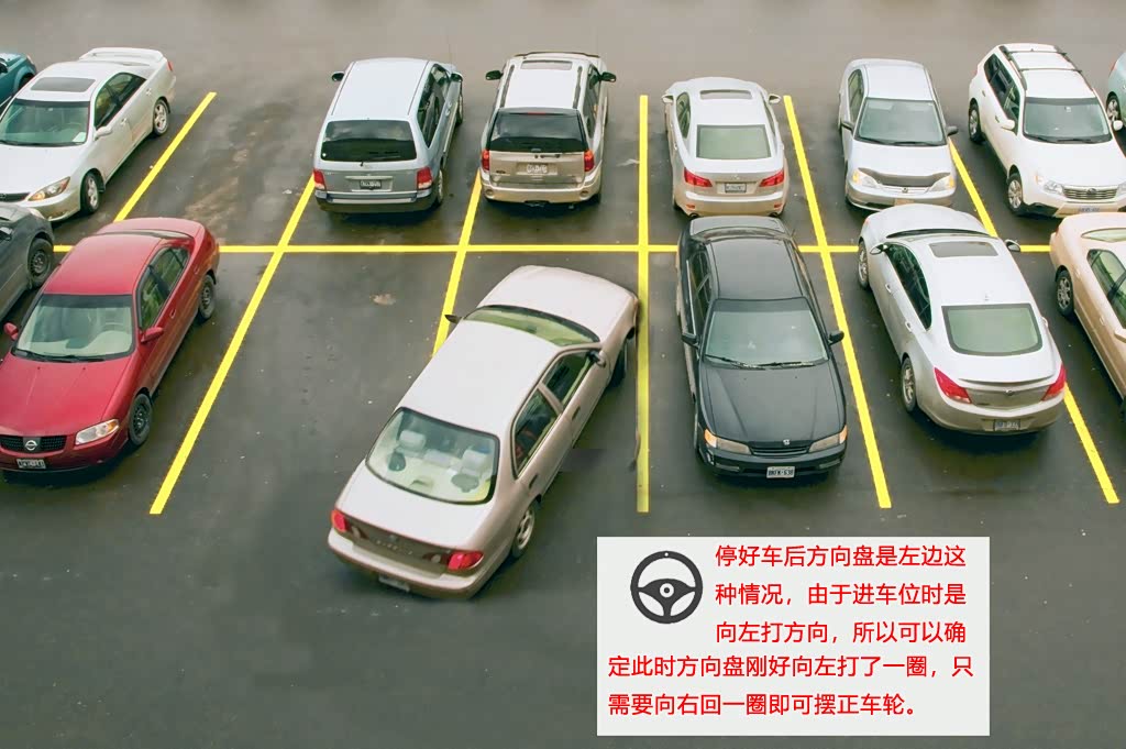 比如上图这种情况,我们是向右打方向倒车入库,停下车后别管方向盘是什么状态,可以肯定的是方向盘一定是往右打了,所以我们继续往右打很快就可以打到底,而家用车的方向就是一圈半左右,既然向右已经打到底了,那么我们再向左回一圈半,摆正方向盘,车轮就摆正了。
