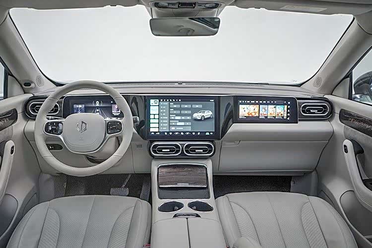 米白色的内饰,配上暗光镀铬材质的运用,整车的品质感还是有的,三连屏的设计,上下镂空的方向盘造型,类似于奔驰的中控台设计,也彰显着精致的气息。由10.25英寸的数字仪表、12.8英寸的中控屏以及10.25英寸的副驾驶专属屏共同组建起的人⻋交互终端。三联屏从左至右娱乐功能逐渐递增,从右向左驾驶功能由轻到弱。