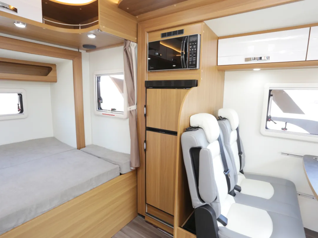 为在行车途中保存食物的新鲜,隆翠凯歌C630双拓旅行版在会客区的后面配备有一台138L的弗罗斯特双开门冰箱,分别为40L冷冻和98L冷藏空间。冰箱的上方配备有一台微波炉,方便进行食物的解冻和加热。