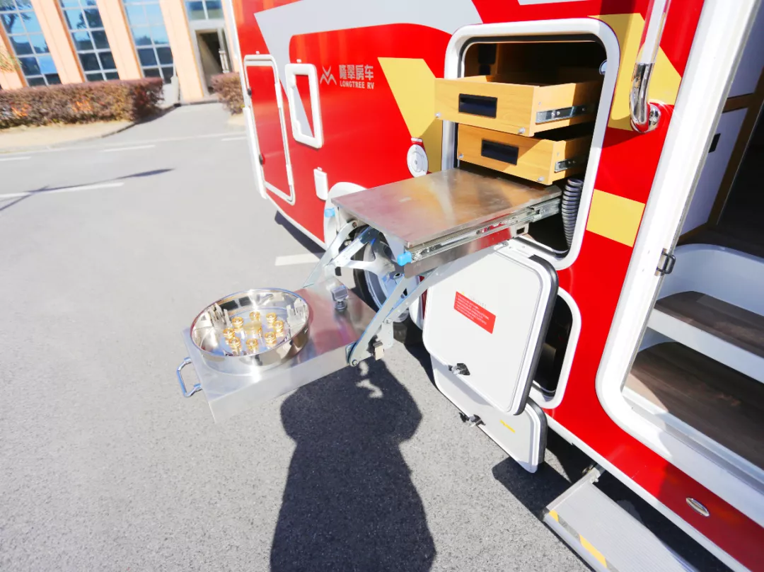 车身外侧配有3.5m多美达遮阳棚,可选配定制版带灯带设计,配置有燃气灶外置厨房,预留有5kg燃气罐舱空间,此外,还拥有水电接口、外置淋浴器及贯通式的储物舱等配置,可在后期选配电动驻车支腿、菲亚玛爬梯、三眼拖车杠、柴油灶等。