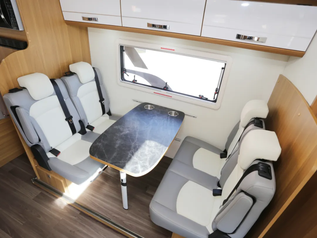 会客区采用了经典的双人对坐沙发的布局,打开房车左侧的拓展区域,整个车中部的活动空间十分充足,能够满足日常的工作、学习、用餐、交流情境需求,沙发中间配备有升降桌板,可以与对坐沙发拼成一张临时床铺供人休息。