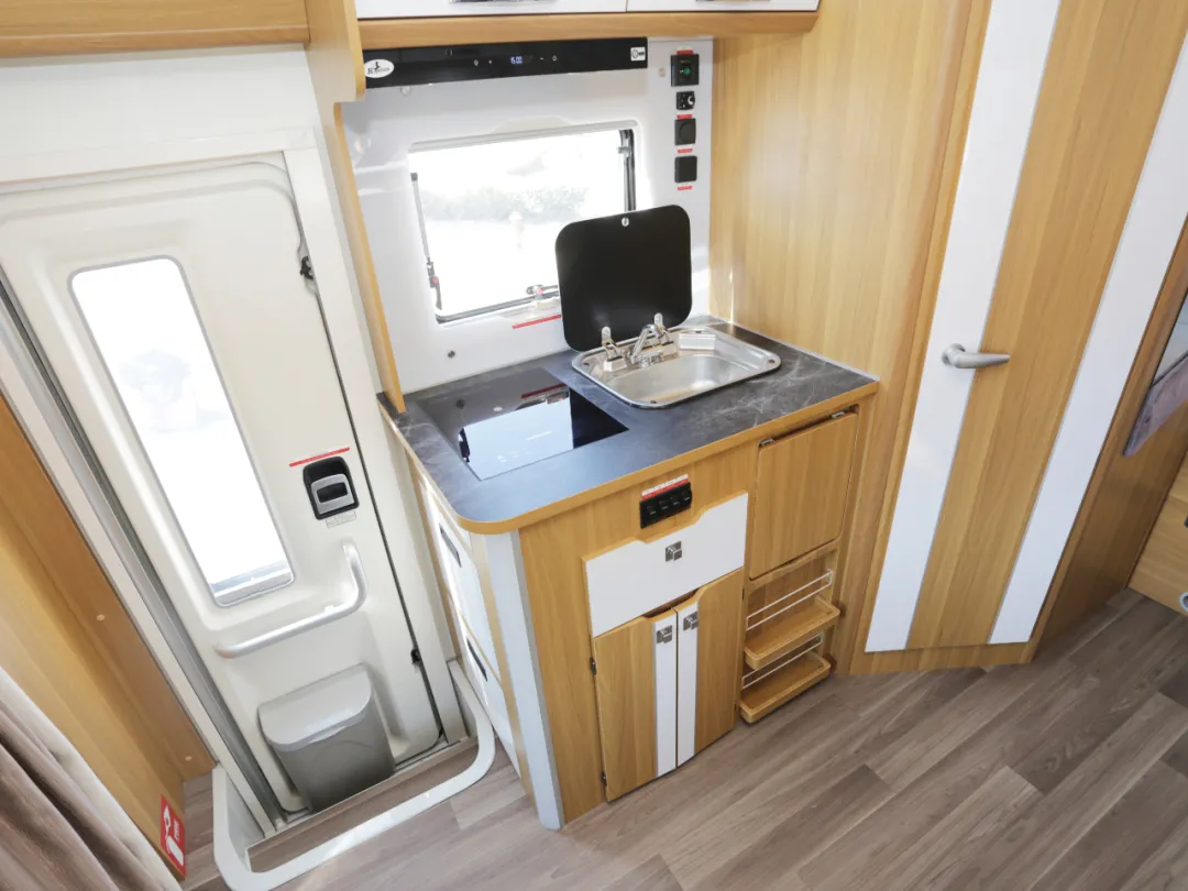 厨房区台面上配有电磁炉、带盖子的洗菜池、折叠水龙头,台面下设计有多个储物柜,打开柜门贯通外部厨房区,方便烹饪操作,台面上配备有房车专用抽油烟机,在车内烹饪不用担心油烟问题。