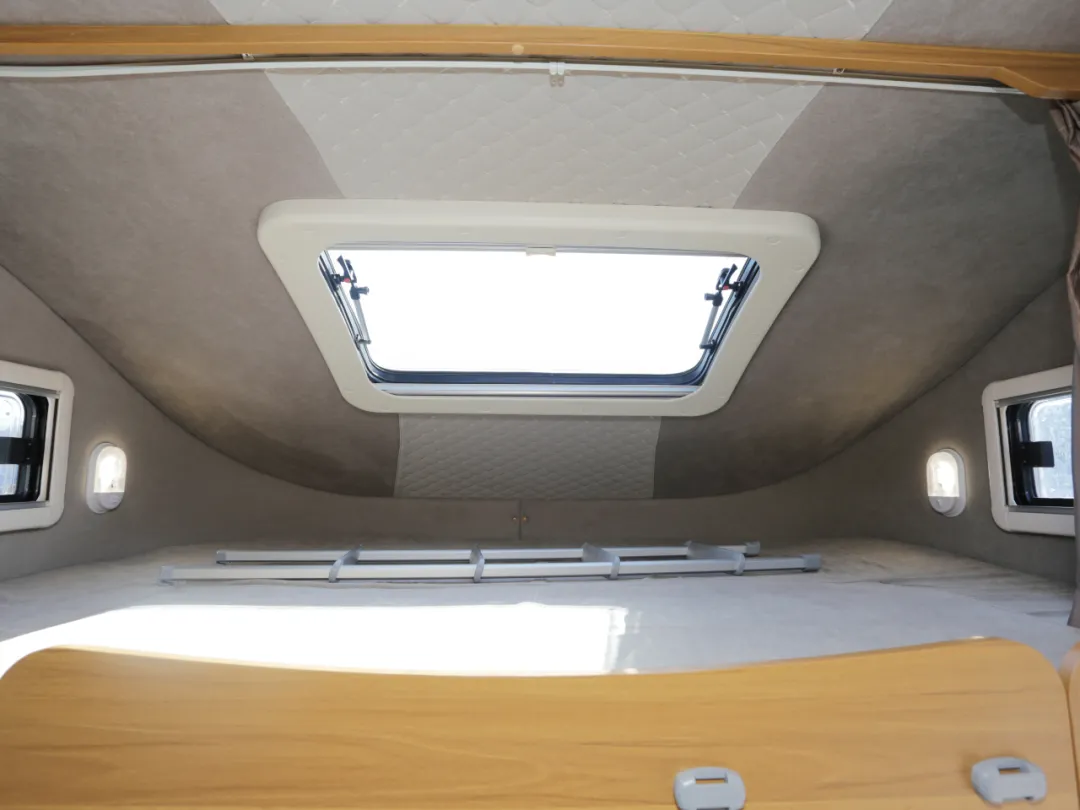 休息区位于房车尾部,后拓展打开后可以供两个成年人在此休憩。床铺三面环窗,通风采光量充足,上方还做了开放式储物仓的设计,方便拿取物品。床铺的周围设计有隐私帘,夜晚拉上帘子可以营造一个静谧的休息环境。