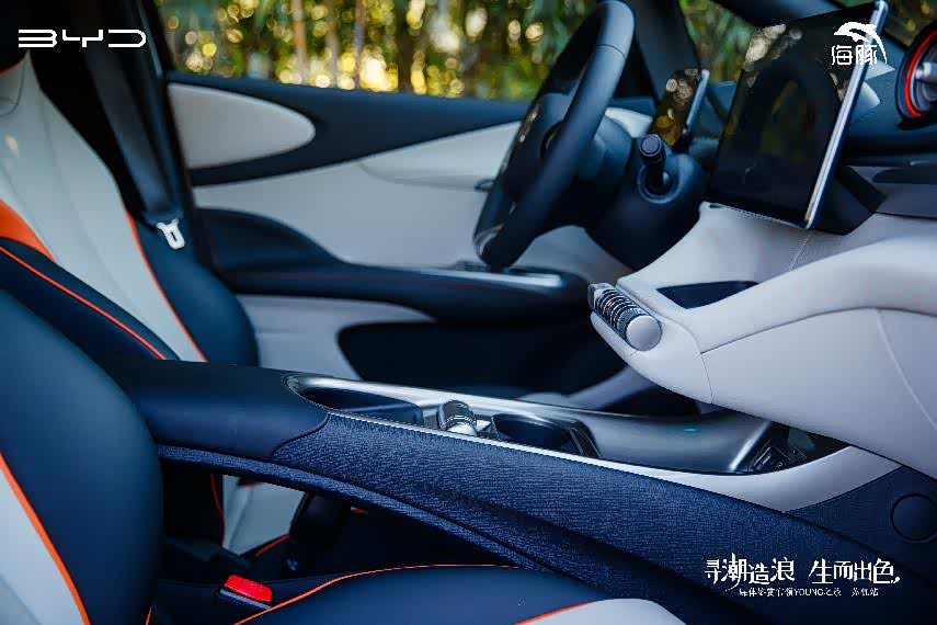 下方空调操控区域设计非常有趣,类似圆柱的造型看起来更显韵律,按键反馈以及质感表现很不错。另外值得一提的是,海豚还首次搭载了比亚迪高能效热泵空调系统,该系统的介入,将让冬季续航能力提升20%。