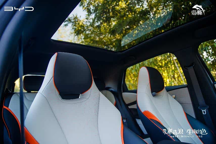 坐上车内,明显能够感受到海豚座椅的舒适度以及包裹性,虽然该车主打经济型,但座椅的舒适度的确是值得称赞,同时,易接触部位还运用了亚光面料包覆。在空间方面,得益于纯电身份,后排地板纯平没有凸起,后排充足的空间能轻松容纳180cm身高的成年人。