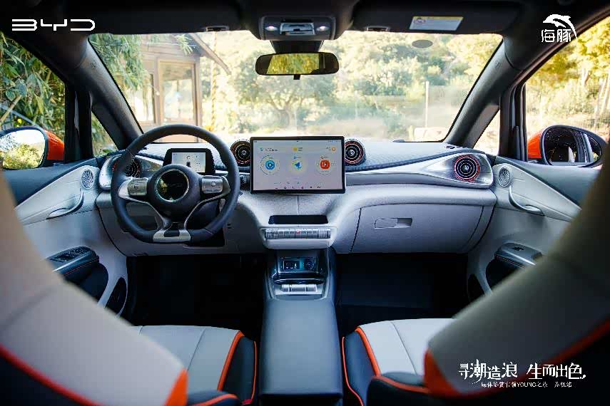 进入车内,海豚整车的内饰设计非常时尚简洁,浅色的主色调让内饰充满了极简风格,空调出风口采用了类似旋涡式的设计,可旋转中控大屏非常实用,配合悬浮式的液晶仪表,展现出不俗的科技氛围,同时,海豚还搭载了DiLink智能网联系统。