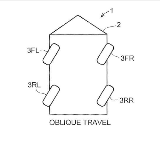 这将允许车辆接入两种独特的车轮位置配置。在第一种配置下,四个车轮全部沿相应的方向转动,允许车辆“沿与前后方向相交的方向直线行驶“。简言之,允许汽车向侧面或以一定角度移动。