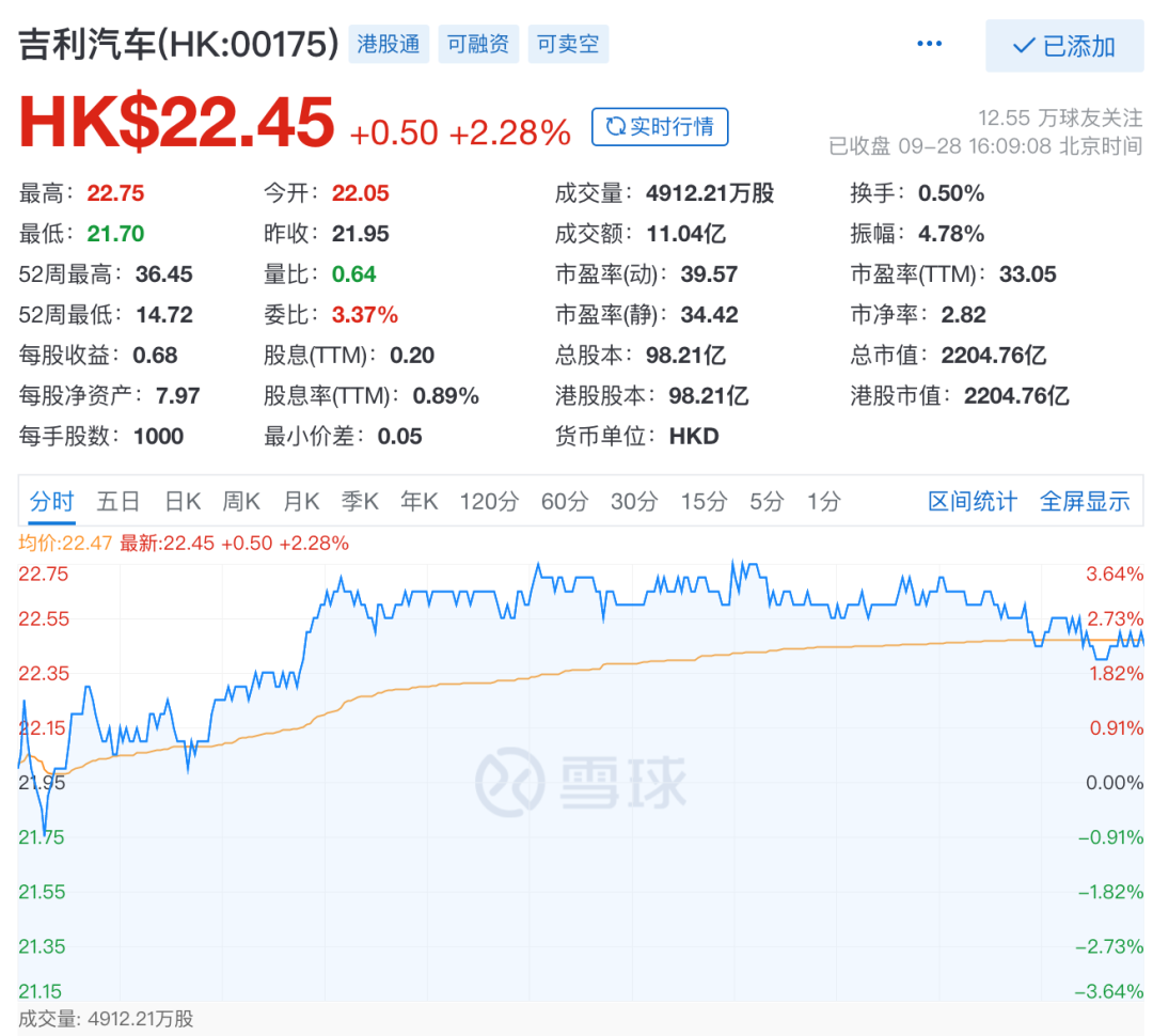 受此消息影响,吉利汽车港股表现昨天上午随即得到强势拉升,午后股价最高去到22.7港元,涨幅为3.42%。