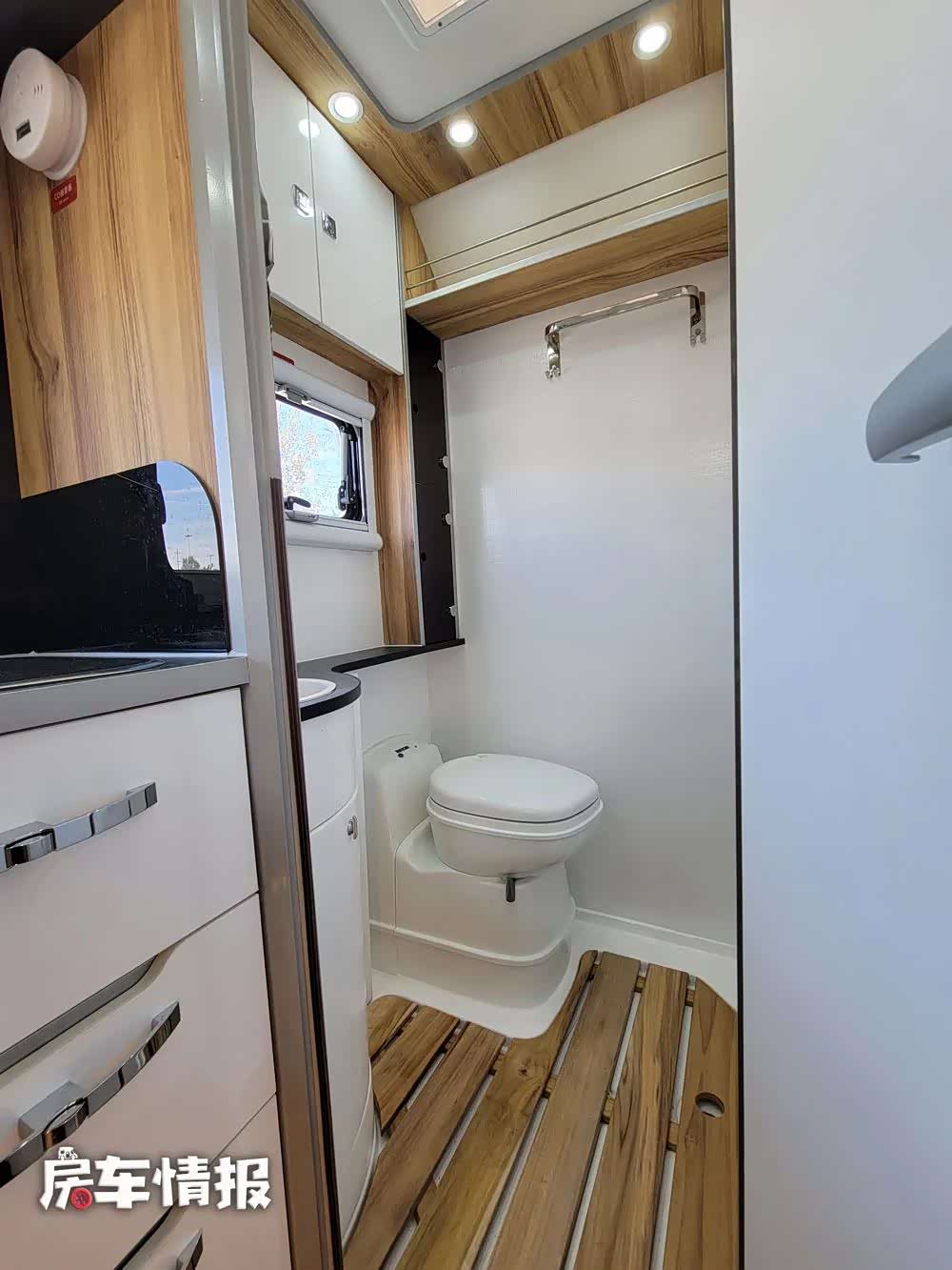 位于车厢尾部的卫浴室内也提供了较为丰富的洗漱设施,包括马桶、淋浴花洒、换气扇、梳妆镜、洗手台和储物柜,可以满足出行的洗漱需求。
