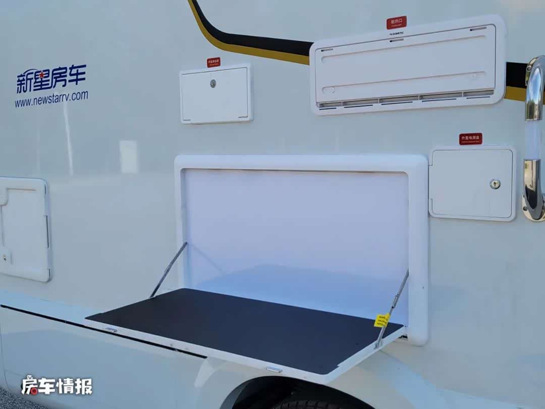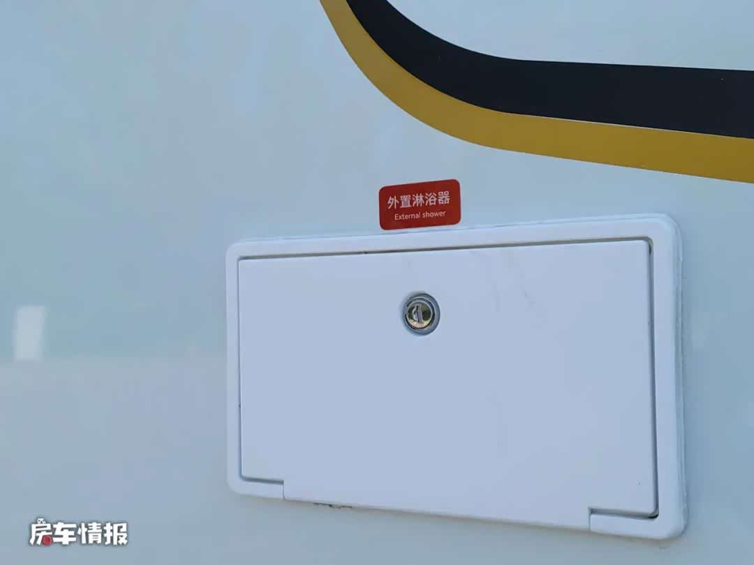 另外在车身外部也配置了比较丰富的生活设施,包括右侧上方的遮阳棚、下方的电动踏步和带LED灯的上车扶手,此外还有外置翻板、外置淋雨花洒、外置厨房(选配)和车身左侧尾部的大尺寸储物舱,为房车生活提供更多的便利。