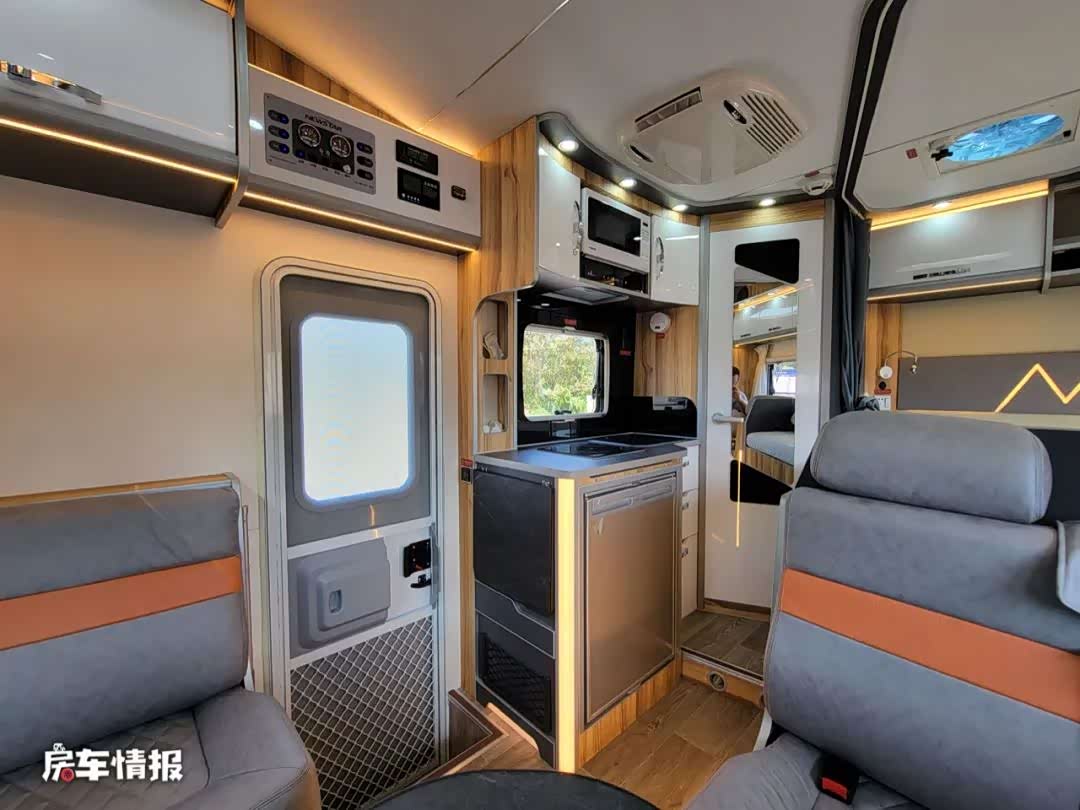 位于乘客门的后方为全车的厨房区,采用了小L型的吧台式设计,同时在侧面还提供了一张可拓展的桌板以扩大整体的使用面积,台面上带有电磁炉和不锈钢洗菜池,下方则是一台110L的车载冰箱,用来满足最基本的烹饪需求。