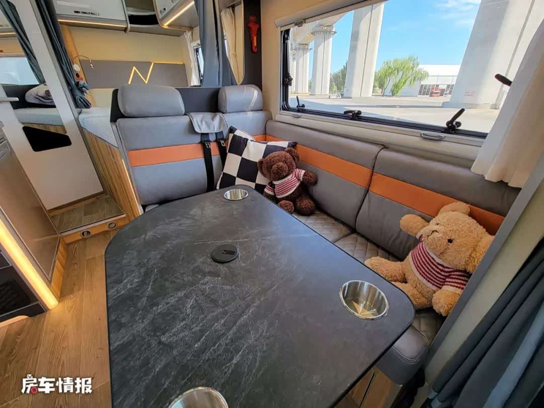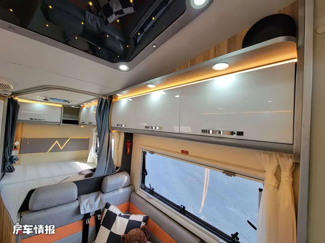 除此之外,在前方驾驶室上方的额头区域内,还提供了一张额头双人床,上方带有一扇大尺寸天窗,可以为整个区域提供良好的采光度。