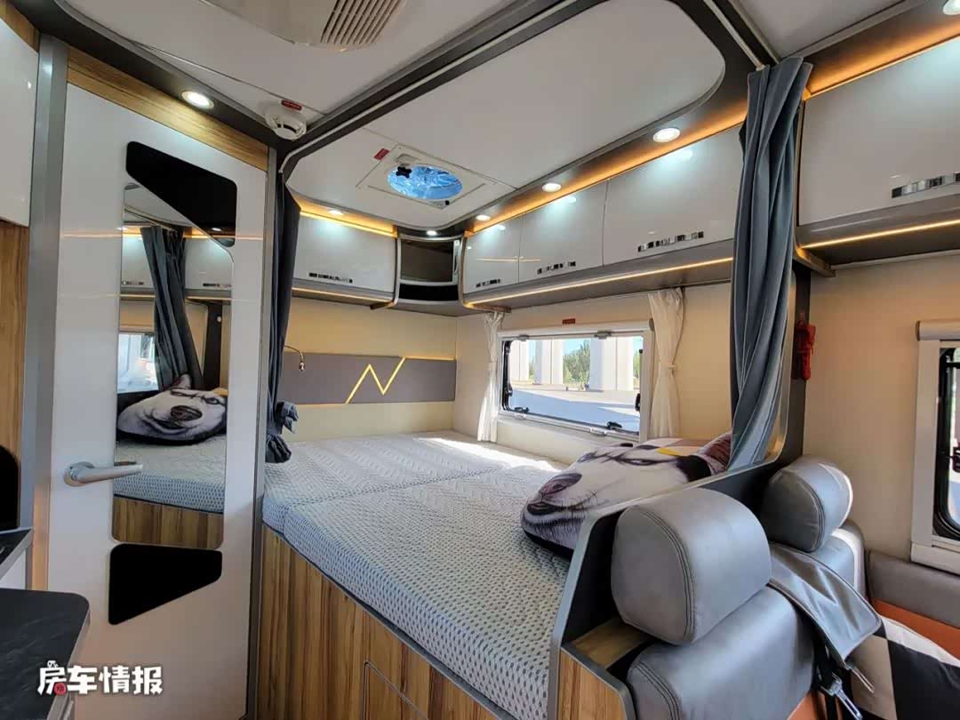 全车的休息区内提供了一张纵置的双人床,带有可存放换洗衣物的储物吊柜,另外床头处还加入了新颖的软包和壁灯设计,精致而美观。