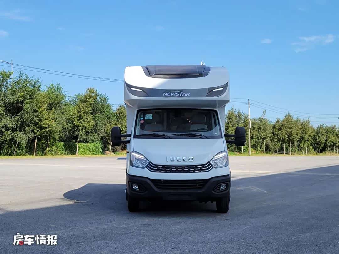 这款房车是基于2021最新款依维柯欧胜底盘所打造的C型房车,大额头的设计不同于以往我们所看到的较为笨重的造型,而是采用了流线性更强的设计,在尺寸方面,全车的长宽高为5990*2278*2980mm,低于3米的整体高度也提升了整车在行驶上路时的通过率。