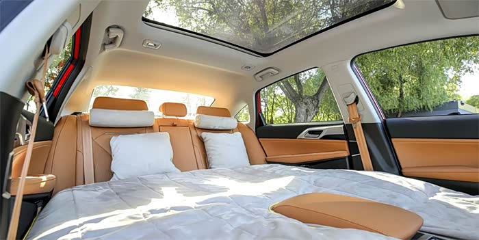 全新小鹏P5十分注重实用性,其前排座椅可以完全躺平,与后排座椅相连形成一张床,同时官方还为整个车厢量身定制了充气床,并配有头枕、被子、收纳鞋袋、隐私窗帘等一系列睡眠套装,之后唤起小鹏语音助手,直接进入睡眠模式即可。此外官方还提供了多种娱乐场景,例如其后排中央位置的头枕可以更换为直联高保真音响系统的定制投影仪,同时在前排区域还可以安装原厂定制的47英寸专属幕布,说白了现在在车里也可以躺着看大片了。