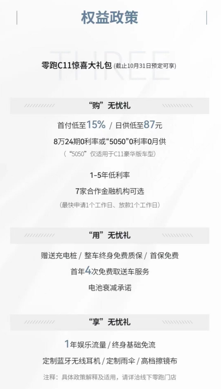 就在上市前夕,官方还在《给零跑C11用户的一封邀请函》里特别指出,将在现场送上惊喜大礼包,车主们关心的车主权益和金融政策都包含其中。