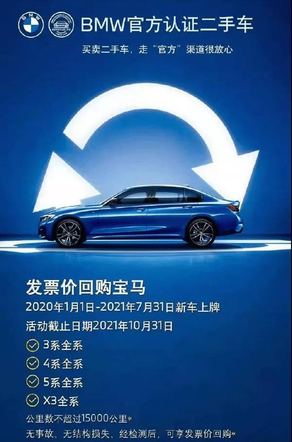 在BBA品牌中,宝马经销商成都宝悦汽车有限公司首先发布信息称:只要是2020年10月1日以后上牌的 宝马3系、X3(不含新能源车),行驶里程不超过1.5万公里,符合准新车车况,经检测后经销商都能以发票价回收汽车。