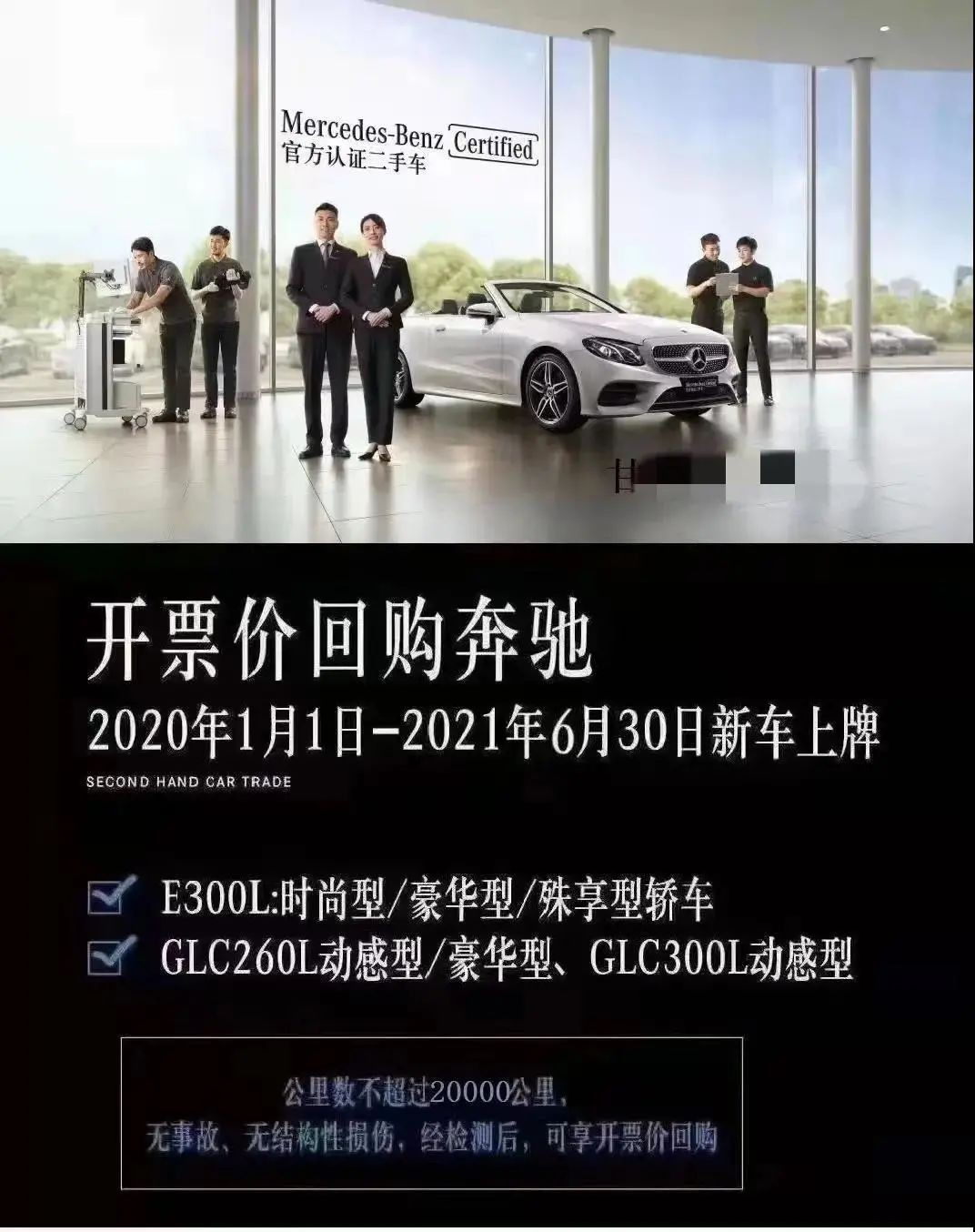 而南京宁星奔驰4S店也发起了高价回收二手车的活动:值得一提的是,该4S店不仅对部分奔驰E级以及GLC车型以开票价进行回购,甚至还加价回购部分新款的E300L车型。