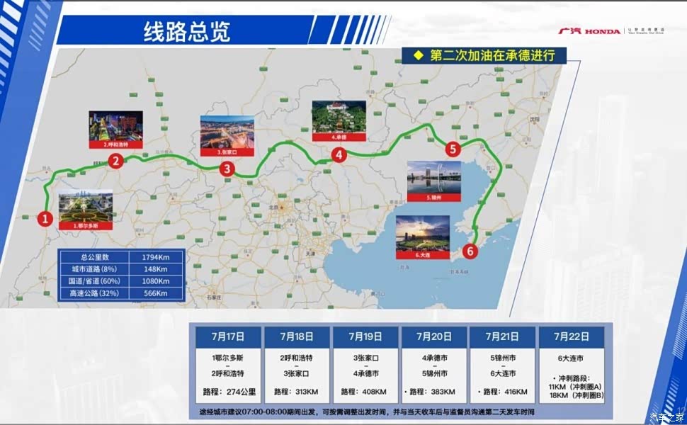 之前出差碰到的节油挑战赛大多都是一天以内的从A点开到B点的短途比赛,单程最多不超过200km。都是A点出发前把汽油加满到跳枪,到B点加油站再加满油跳枪来计算选手的成绩。广汽本田的极限挑战赛则完全不同,不光7天6晚的历时时间更久、从鄂尔多斯到大连的行驶里程更远有1794km,最最重要的是要把车开到彻底没有油为止。再加上比赛日正好赶上三伏天,对于不开空调、车窗紧闭的挑战者们来说,更是一场体能上的考验。