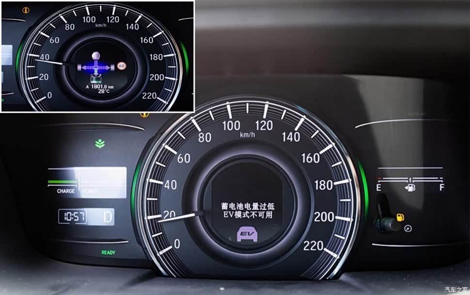 但几个反复下来,当速度溜到20km/h的时候,这时再按EV模式,电脑提示蓄电池电量过低EV模式不可用,所以这时只能发动机启动驱动车轮、给电池充、把速度再悠到40km/h,再重复永动机模式。