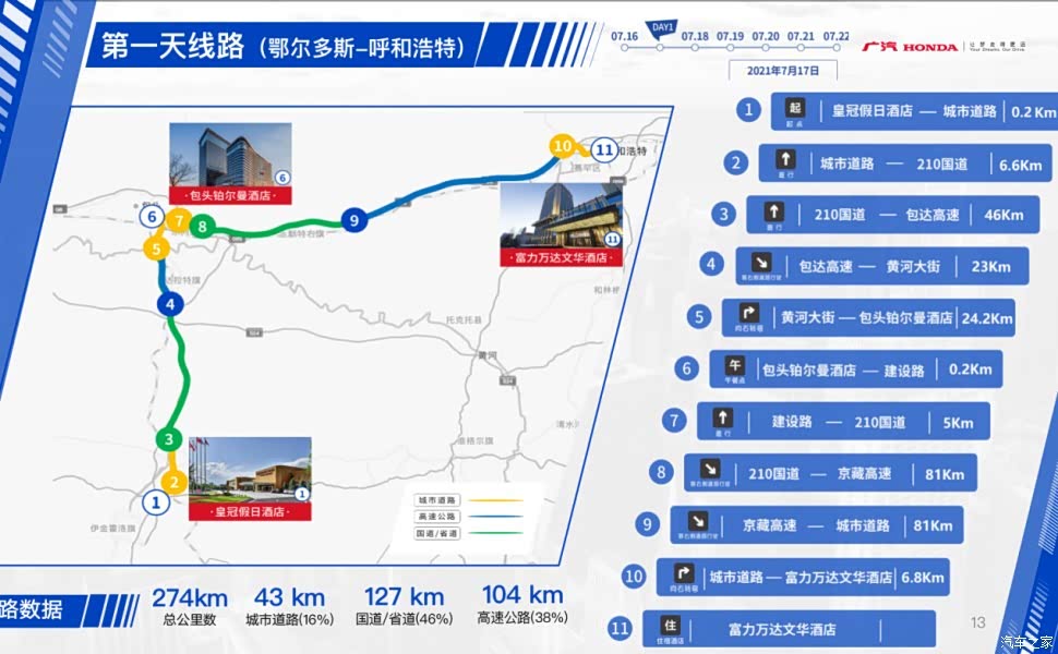 Days 1(7月17日)路程:274km(城市道路43km+高速公路104km+国道127km)
