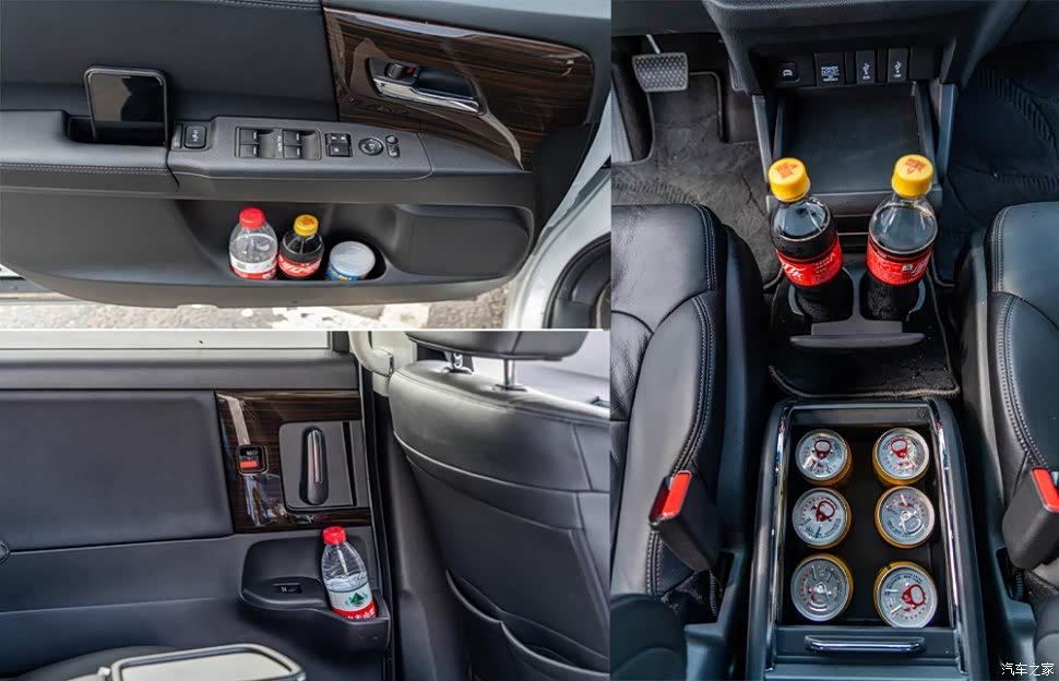 作为一台MPV,储物空间肯定是它的强项,前排中间有储物格,还可以放这么多饮料。前门上还可以放3瓶水,拉手也是封死的,可以放手机。后排两个侧滑门各有一个水杯架,后排两个航空座椅中间还有两个杯架。