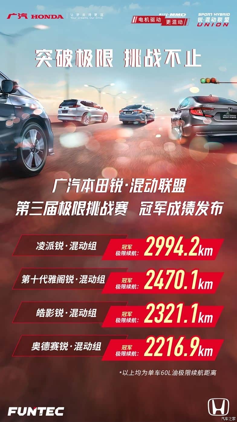 广汽本田锐·混动联盟的四台车,作为普通的家用车,这样的成绩让我们惊掉了下巴。不断被征服的美丽线路,不断被刷新的节油记录,还有对节油挑战赛乐此不疲的广汽本田车主。他们甚至开玩笑说,以前的本田是买发动机送车,现在还变相送油卡呢。在碳达峰、碳中和的大目标下,搭载Honda第三代i-MMD双电机混动技术的广汽本田锐·混动联盟家族再次用实力刷新了一个又一个奇迹。