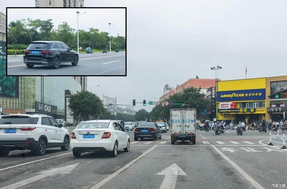 7点多的锦州市区,车明显已经有些多了。看这辆奔驰GLC主副驾驶的太阳膜贴的太满了,虽然夏天时会多阻隔一些阳光,但没有留出看后视镜的透明区域,夜间行车视线会受影响。